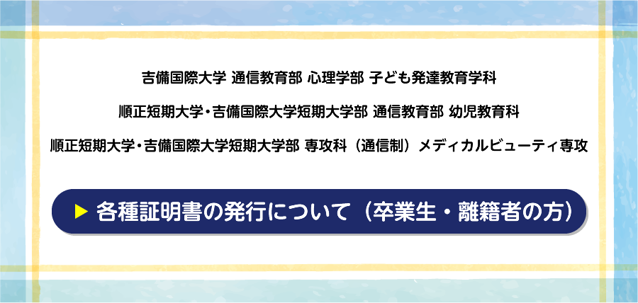 トップページ 令和3年度以降の学生募集は行いません 順正短期大学・吉備国際大学短期大学部卒業生の方へ(証明書発行について) 専攻科(通信制)メディカルビューティー専攻 通信教育部幼児教育科 お知らせ 2025年12月19日 証明書発行サービスのシステムメンテナンス実施について(2/26)… 2025年12月15日 冬季休業期間の証明書発行について 2025年11月21日 証明書発行サービスのシステムメンテナンス実施について(12/18)… 2025年10月7日 証明書発行サービスのシステムメンテナンス実施について(11/20)… 2025年7月25日 夏季休業期間中の証明書発行について(8/9~8/17) 2025年6月27日 証明書発行サービスのシステムメンテナンス実施について(7/22)… お知らせ一覧を見る